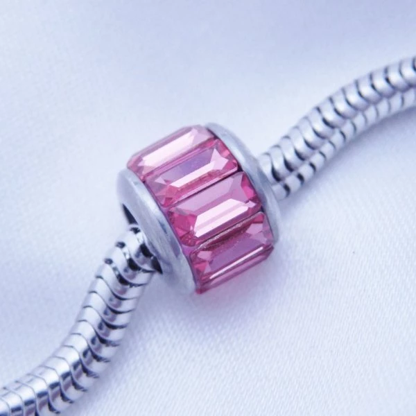 Korálek z chirurgické oceli barevný se zirkony. Zirkony jsou po celém obvodu korálku. Barva růžová Průměr: 10mm Šířka: 8mm Vnitřní průměr: 5mm