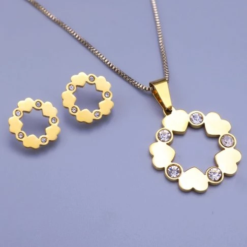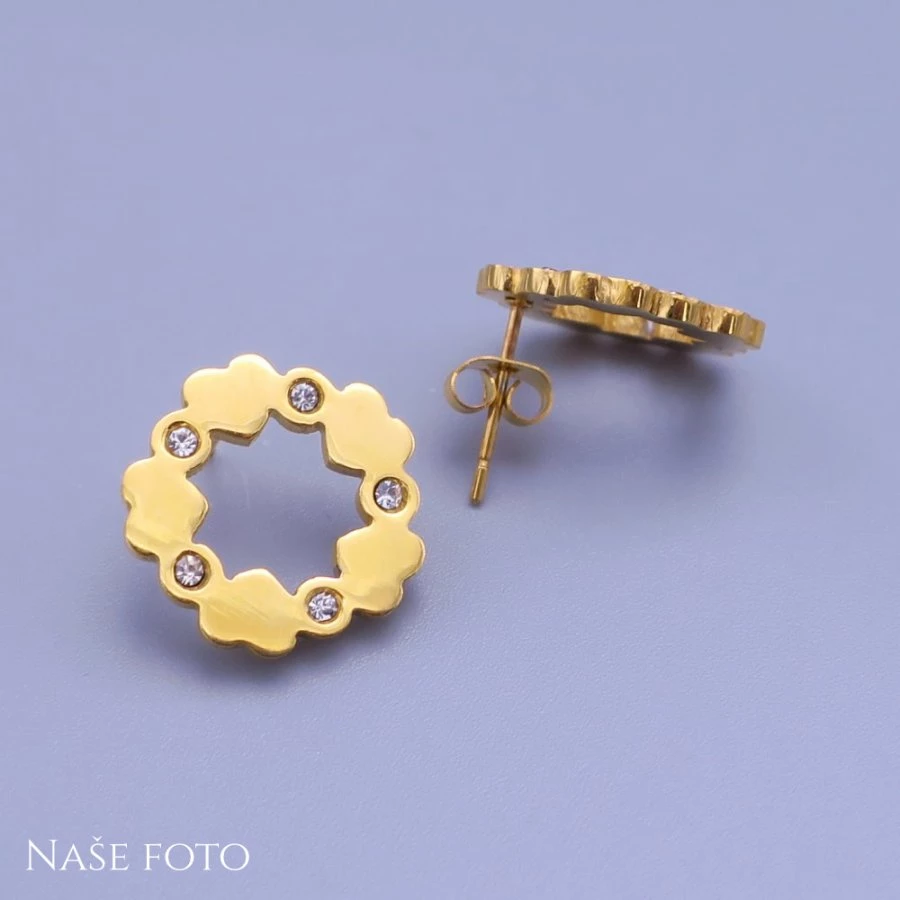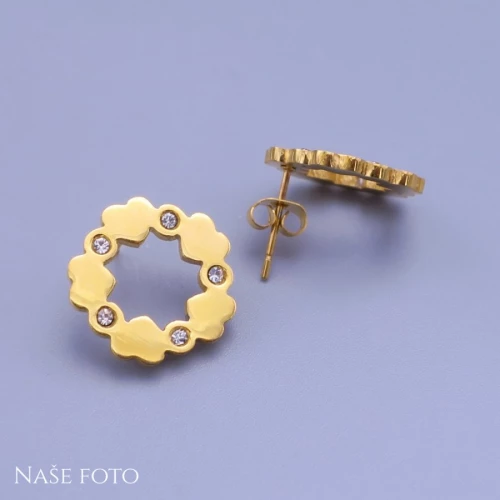 Nádherná dámská souprava náušnic a řetízku s přívěskem z pozlacené chirurgické oceli. Náušnice jsou peckové na puzetové zapínání. Stejně tak jako přívěsek v soupravě, mají náušnice tvar přípomínající květinku, tvořenou spojovanými srdíčky a zářivámi kamínky. Tato souprava vypadá velice elegantně a hodí se nejenom pro každodenní nošení, ale také jako doplněk na plesy, večírky a jiní speciální události.