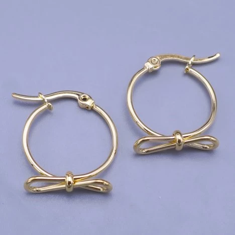 Roztomilé dámské náušnice z pozlacené chirurgické oceli - kroužky zdobené mašličkou. Náušnice jsou ve spodní části zdobené mašlí. Povrch náušnic je hladký a lesklý. Vypadají velice roztomile, přesto decentně. Jsou střední velikosti a hodí se pro každodenní nošení.