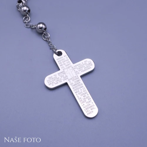 Pánský růženec z chirurgické oceli s kuličkami - kříž, madonka. Řetízek má délku 66cm, na madonce je zavěšen řetízek s křížkem o délce 13,5cm. Růženec je vyroben z chirurgické oceli, která je vhodným materiálem pro výrobu šperků díky svým vlastnostem jako je pevnost, odolnosti proti poškrábání a namáčení. Je vhodná také pro osoby s alergiemi na běžné kovy.