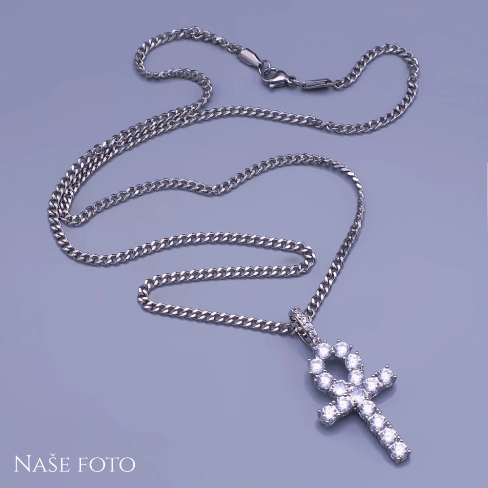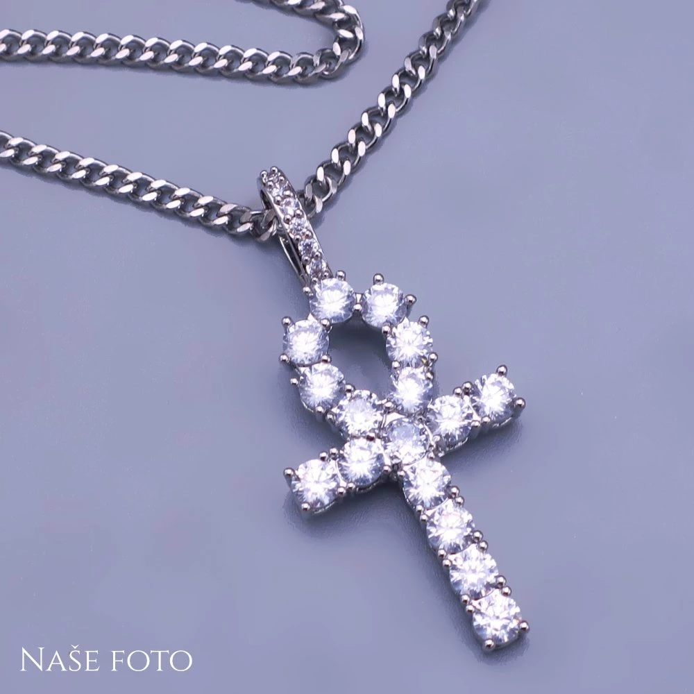 Luxusní přívěsek Nilský kříž z chirurgické oceli je zdobený čirými zirkony.