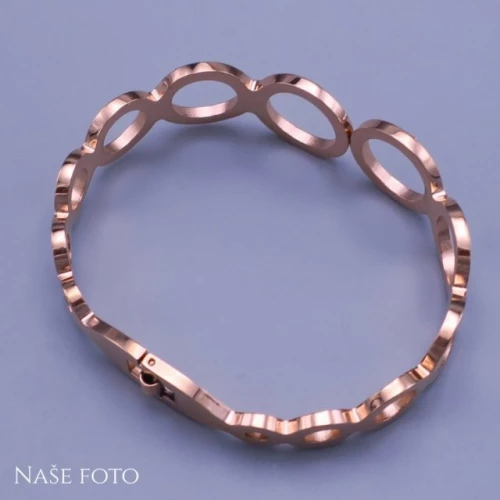 Luxusní dámský náramek z chirurgické oceli v barvě rose gold. Náramek má tvar kruhů, postupně se zvětšujících směrem k přední části náramku. Dva přední kruhy jsou zdobeny třpytivými kamínky, které náramek povznáší na luxusní úroveň. Zapínání náramku je velice jednoduché, pohodlné pružinové. Otvírá se tedy jednoduše roztažením dvou předních kruhů. Je vhodný na plesy, večírky, speciální přiležitosti, ale určitě jej využijete také při každodenním nošení.