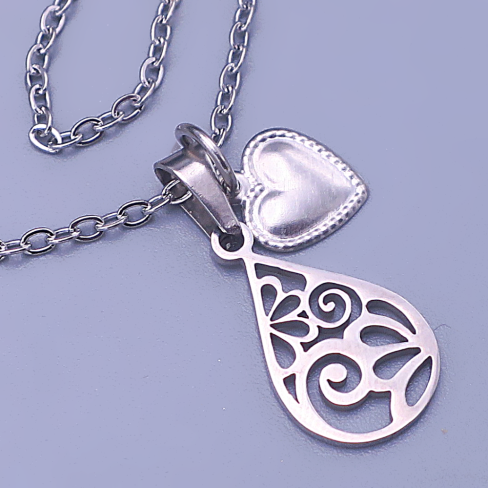 Elegantní náhrdelník z chirurgické oceli s přívěsky – slzou s filigránovým vzorem (15×10 mm) a ocelovým srdíčkem (8 mm).