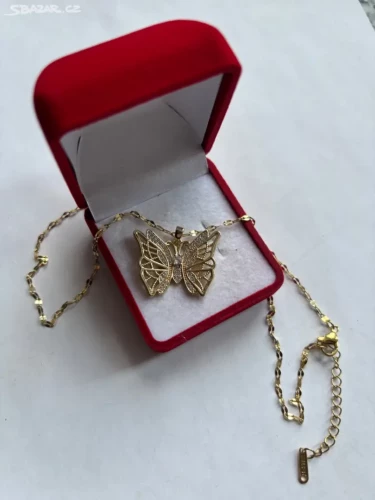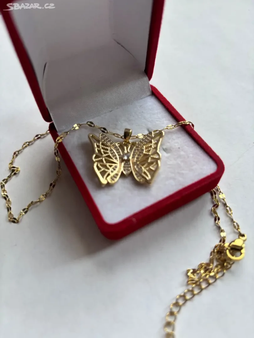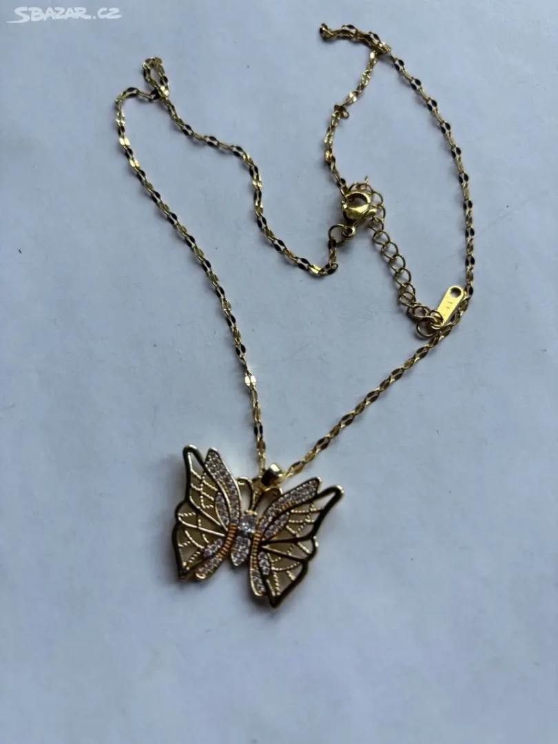 Náhrdelník zlacený zdobí průhledný motýlkový přívěsek zdobený čirými kubickými zirkonky