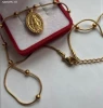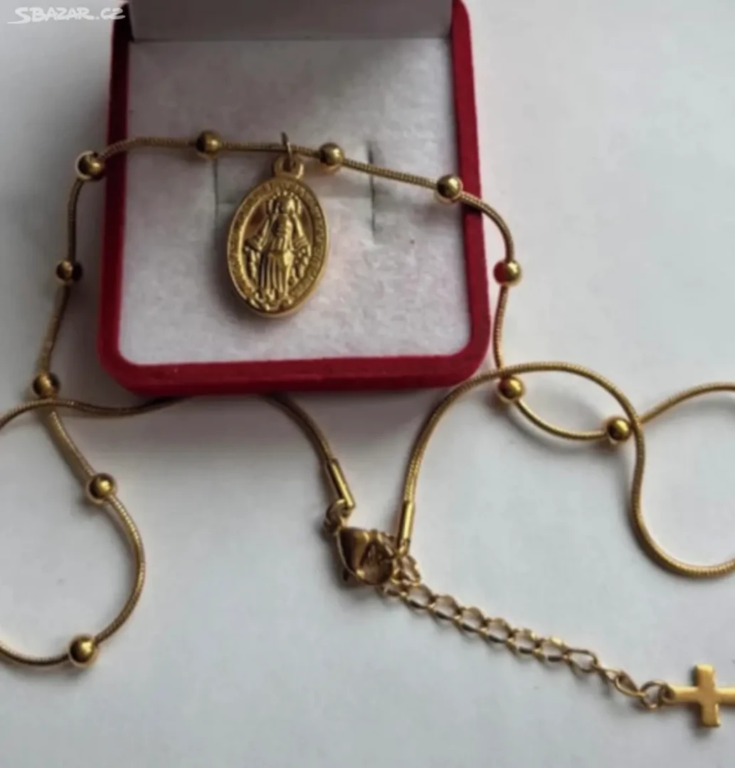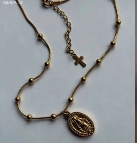 Náhrdelník zlacený z chirurgické oceli s pannou Marií a korálkovým řetízkem v délce 40+5cm s nastavitelnou délkou a konec řetízku zdobí maličký zlacený křížek