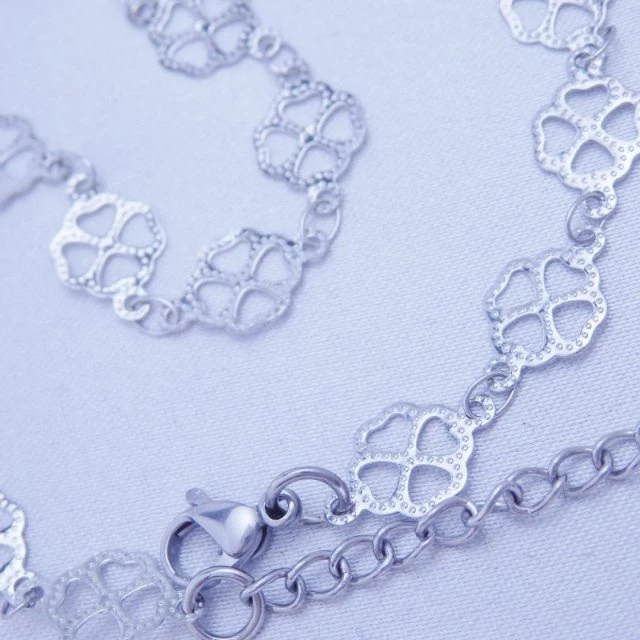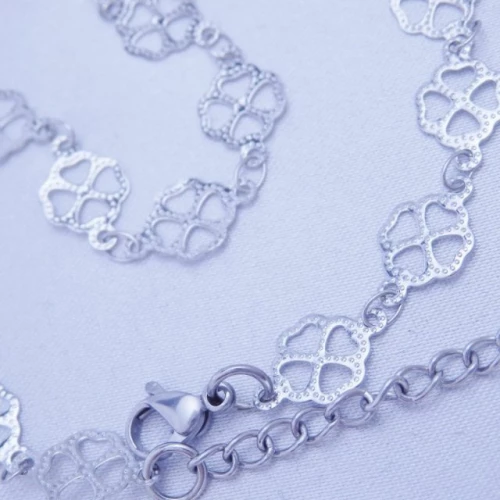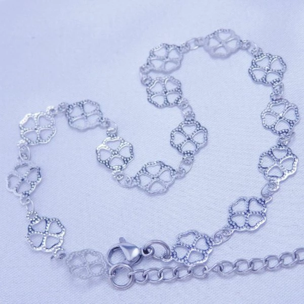 Náramek z leštěné chirurgické oceli se skládá z čtyřlístků o velikosti 8mm . Šířka :8mm Délka nastavitelná od 24cm do 28cm . K náramku na kotník nabízíme také náramek na ruku a řetízek . V letních měsících se můžete z náramkem koupat jak na koupalištích tak i v moři . Je vhodný pro alergiky na běžné kovy. NH24