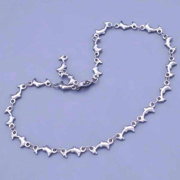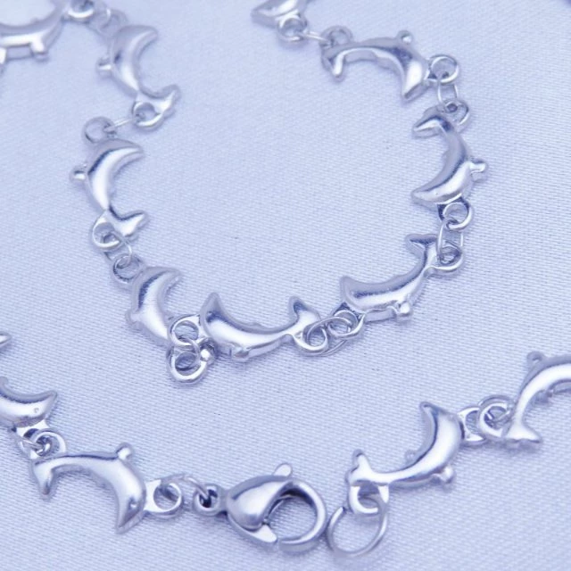 Náramek z leštěné chirurgické oceli se skládá z delfínků o velikosti 10x5mm . Šířka :5mm Délka nastavitelná do 28cm . K náramku na kotník nabízíme také náramek na ruku a řetízek . V letních měsících se můžete z náramkem koupat jak na koupalištích tak i v moři . Je vhodný pro alergiky na běžné kovy. NH1
