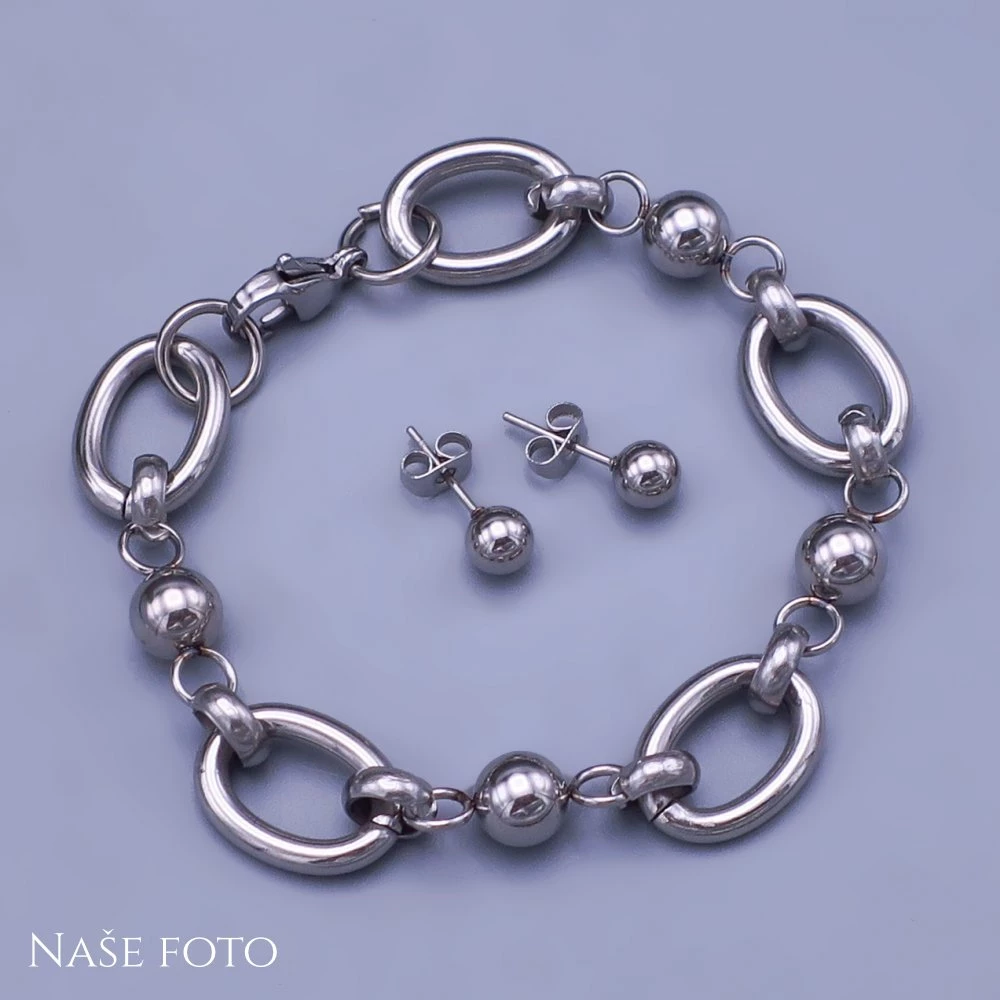 Souprava z leštěné chirurgické oceli se skládá z náramku a náušnic.