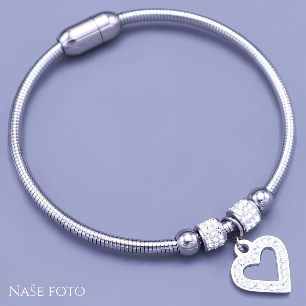 Krásný náramek z leštěné chirurgické oceli lankového typu je zdoben srdíčkem 14mm a korálky, zdobené čirými zirkony.