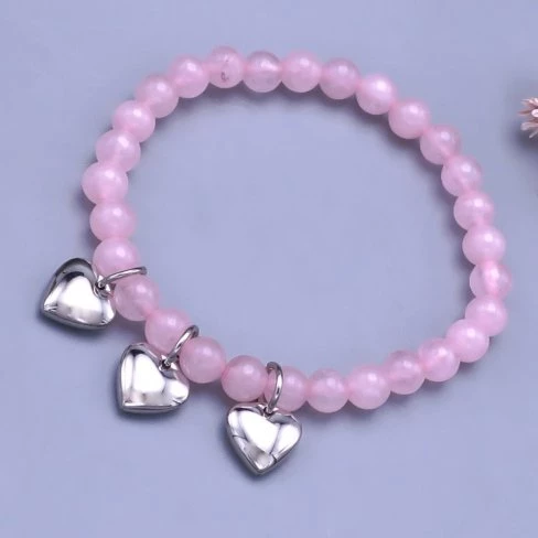 Náramek z korálků růženínů je zdoben oboustrannými srdíčky z chirurgické oceli.