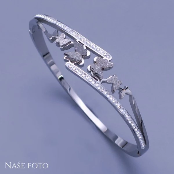 Krásný náramek z leštěné chirurgické oceli je zdobený čirými zirkony a 3D motýlky. Náramek je vyroben do oválného tvaru, díky kterému dobře sedí na zápěstí. Šířka náramku spodní části je 2mm. Šířka vrchní části náramku 4mm - 13mm. Náramek je vhodný na velikost zápěstí 16cm - 17cm. 22532