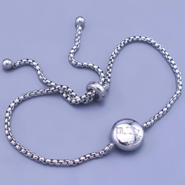 Náramek z leštěné chirurgické oceli je zdoben ocelovým kolečkem 11mm zdobeným zirkonem a gravírovanou konstelací ve znamení BLÍŽENCI Šířka náramku 2mm. Délka je nastavitelná utažením a to korálkem, který je opatřen z vnitřní strany průhledným pevným silikonem. Velikost UNI. 2115 2116
