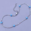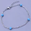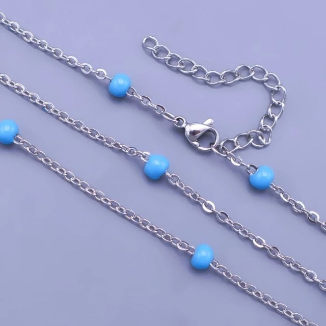 Náramek z chirurgické oceli o šířce 2mm je zdobený modrými perličkami 5mm. Délka je nastavitelná a nabízíme v těchto variantách. od 15cm - 18cm od 17cm - 20cm od 19cm - 22cm K náramku nabízíme také řetízek na krk a na nohu. 2096