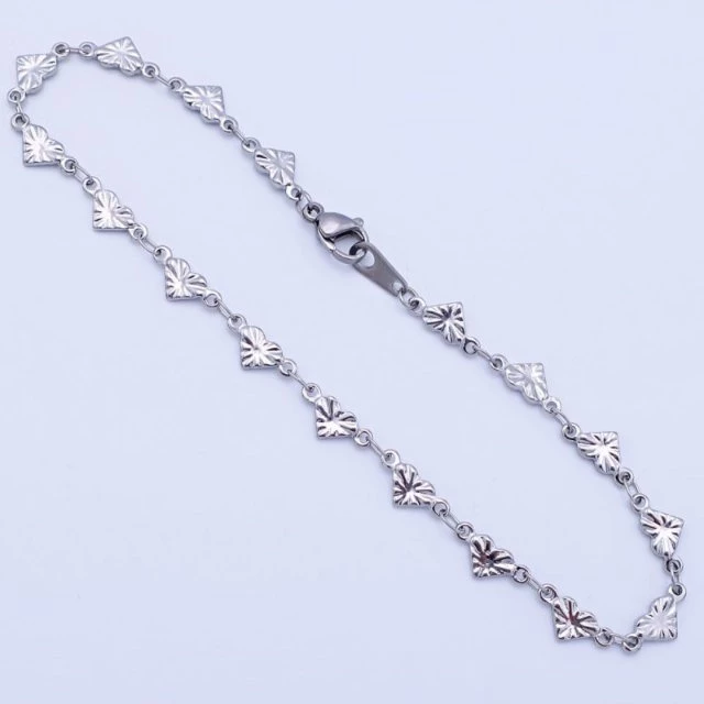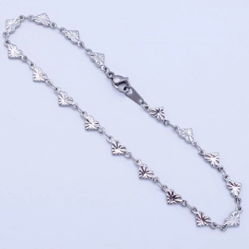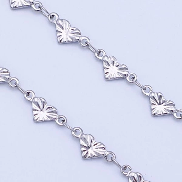 Dámský náramek z leštěné chirurgické oceli je složený z oboustranných srdíček o velikosti 4x5mm, které jsou zdobené rytím. Šířka 4mm. Délka na výběr od 16-17-18-19-20-21-22cm K náramku nabízíme také řetízek a náramek na kotník. 1202