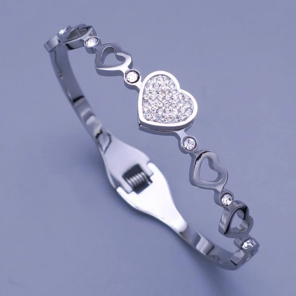Náramek z leštěné chirurgické oceli zdobený srdíčky a kamínky. Šířka zdobené části náramku je 7mm. Šířka nezdobené části náramku je 3mm. Náramek je vyroben do tvaru oválku, díky kterému krásně sedí na zápěstí. Velikost UNI. Vnitřní délka náramku je 17cm. 25550
