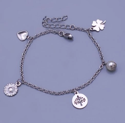 Jemný náramek z leštěné chirirgické oceli, zdobí přívěsky.
