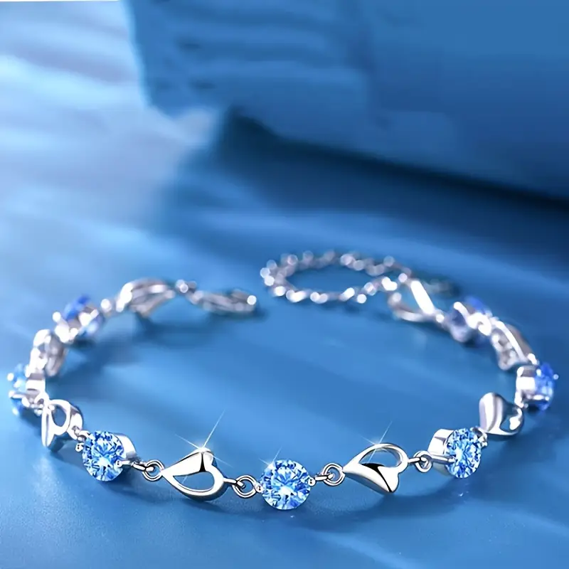 Ženský elegantní náramek s otevřeným srdcem se syntetickým kubickými zirkony ve světlé modré barvě ve velikosti 3mm a velikost srdíček 7mm