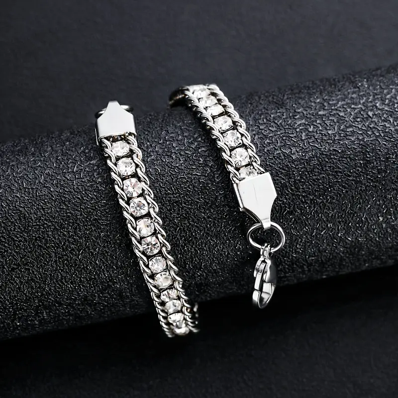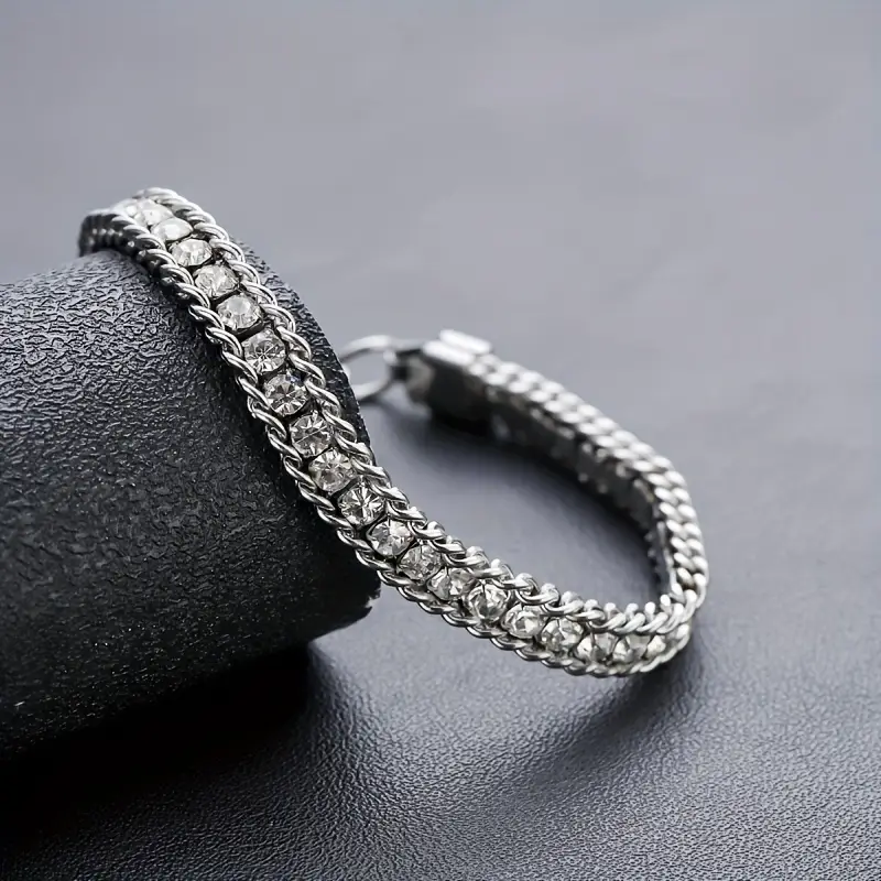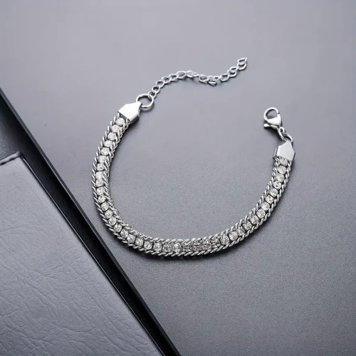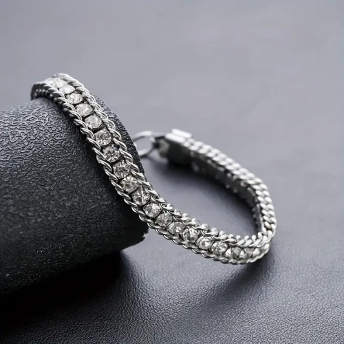 Krásný náramek z chirurgické oceli zdobený štrasovými kamínky které jsou pevně zafixovány pomocí drážkového závěsu.Zadní strana je dobře opracováná a neškrábe kůži