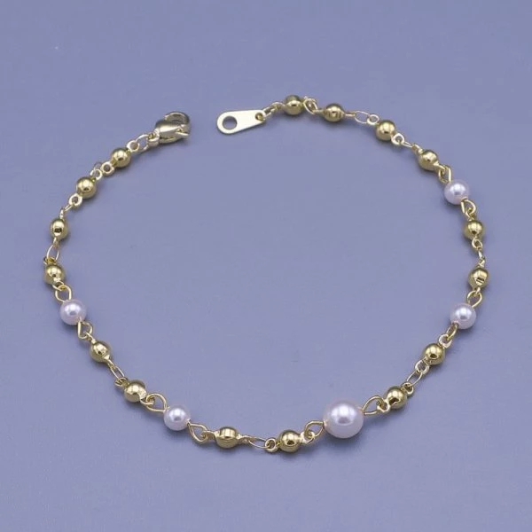 Kuličkový náramek z chirurgické oceli je zdoben Swarovski perličkami v bílé perleťové barvě. Šířka náramku 3mm Velikost Swarovski perliček 4mm, 6mm. Povrchová úprava zlacení 14kar. v ČR bez niklu. Odstín českého zlata. Délka nastavitelná do 21cm 37