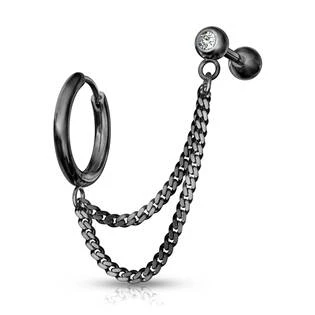 Náušnice a cartilage piercingu do ucha spojené řetízkem. Řetízek není odnímatelný