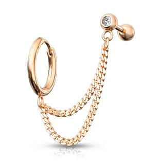 Náušnice a cartilage piercingu do ucha spojené řetízkem. Řetízek není odnímatelný
