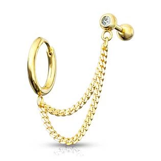 Náušnice a cartilage piercingu do ucha spojené řetízkem. Řetízek není odnímatelný