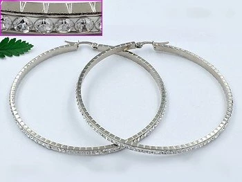 Náušnice, kruhy z chirurgické oceli zdobené po celém obvodu náušnice skleněnými kameny. Průměr náušnice 7 cm, šířka 0,3 cm. 20841