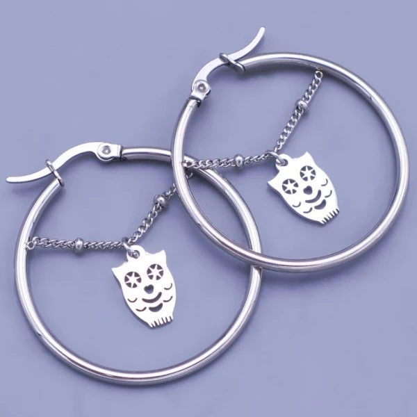 Náušnice kruhy z leštěné chirurgické oceli jsou zdobené sovičkami 10x7mm. Velikost kruhů 35mm. Šířka 2mm. 2170