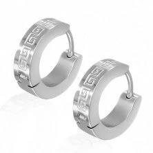 Lesklé náušnice z chirurgické oceli stříbrné barvy mají kruhový tvar a zdobí je gravírovaný řecký vzor. Šířka: 4 mm Vnější průměr: 13 mm Vnitřní průměr: 9 mm