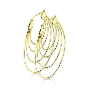 Ocelové náušnice kroužky Náušnice jsou vyrobeny z chirurgické oceli s jakostním označením 316L a mají povrchovou úpravu v barvě žlutého zlata Parametry materiál chirurgická ocel povrchová úprava žluté zlato typ uzávěru kroužek Rozměry délka 5cm Velikost kruhů 2cm-2.5cm-3.5cm-4.5cm