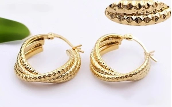 Krásné náušnice z chirurgické oceli ve zlatém provedení. Náušnice třířadé kruhy, zdobené. Rozměr 26x23mm Hmotnost 9g