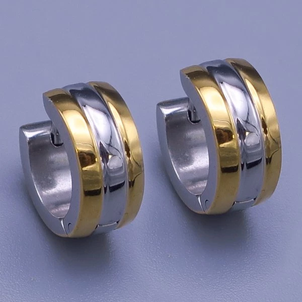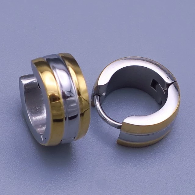 Dámské náušnice z chirurgické kombinované s pozlacením. Zlaceno 14 kar. zlatem Průměr náušnic 12mm a šířka 5,5mm. Zapínání na zacvaknutí Chirurgická ocel je vhodná pro alergiky na běžné kovy. 220045