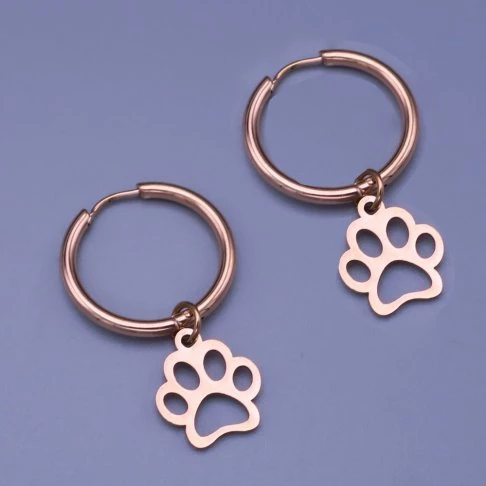 Krásné dámské náušnice z pozlacené chirurgické oceli - kroužky s tlapkou. Náušnice jsou zlaceny do moderní a velice oblíbené barvy růžového zlata (RoseGold). Jsou střední velikosti a zapínají se jednoduchým kruhovým zapínáním. Na náušnicích je zavěšen přívěsek ve tvaru zvířecí tlapy. Náušnice jsou vhodné na párty, večírky i každodenní nošení.