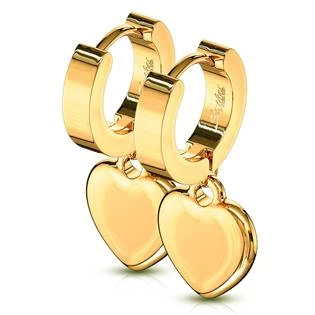 Zlacené ocelové náušnice kruhy s visacími srdíčky