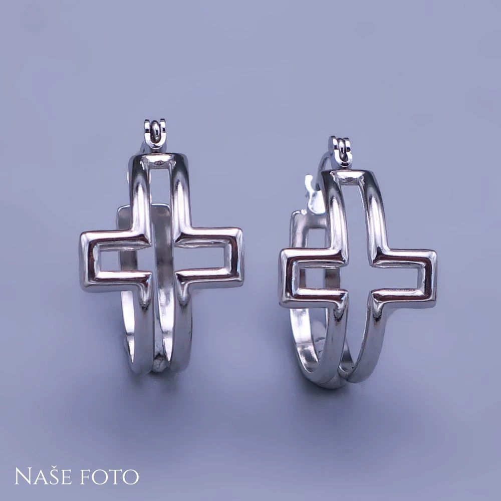 Náušnice kruhy z leštěné chirurgické oceli ve tvaru křížku.
