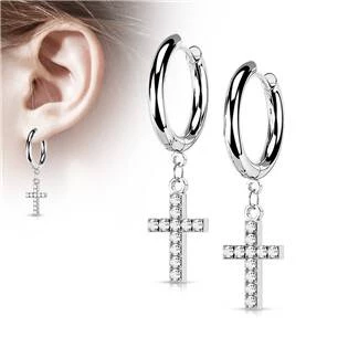 Ocelové náušnice kroužky dekorované zavěšenými křížky se zirkony