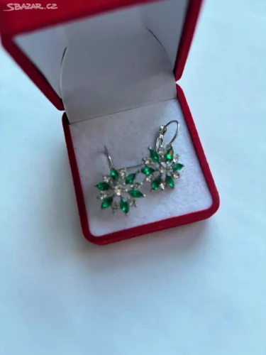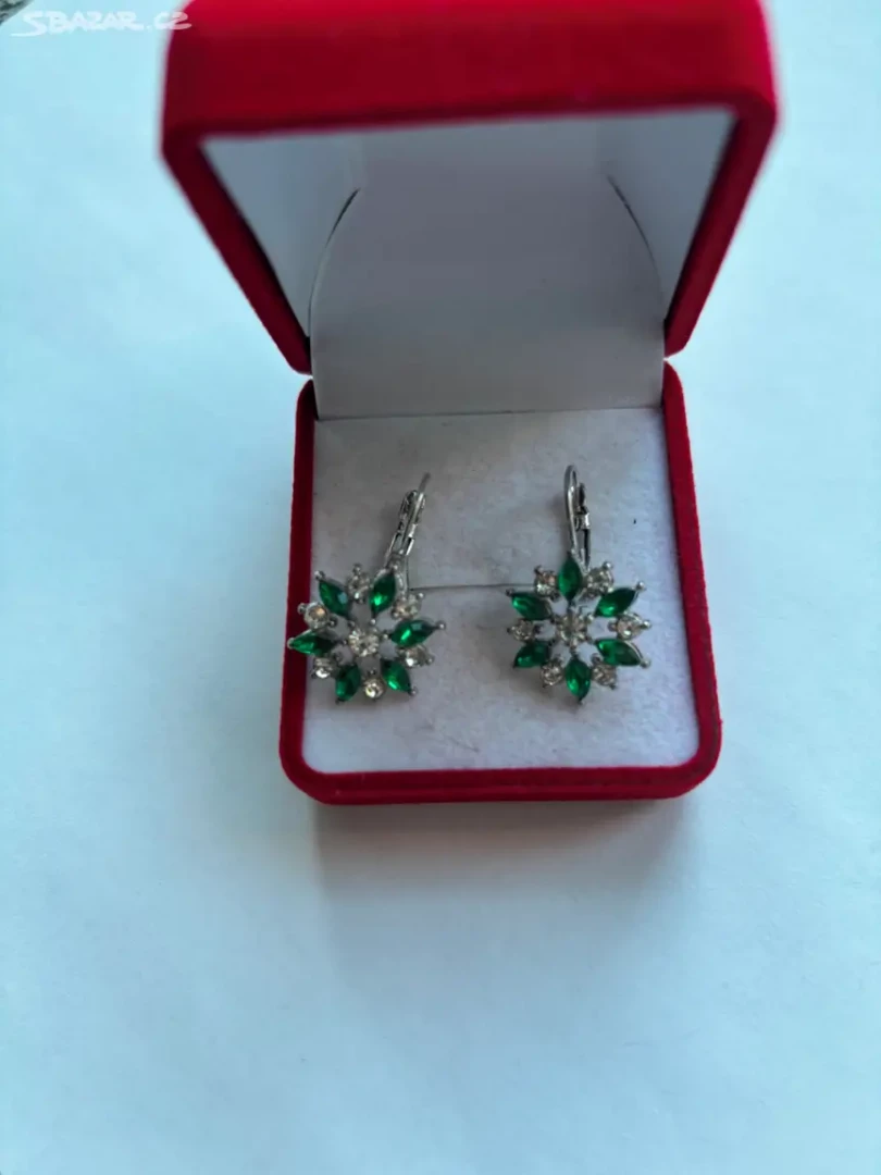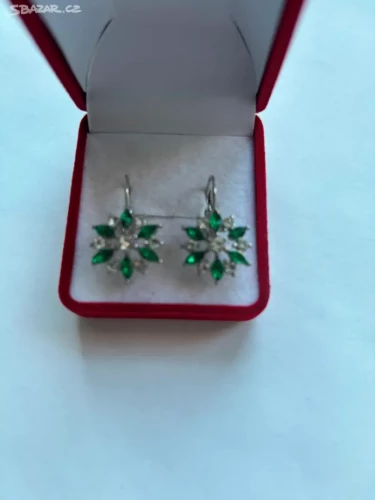 Krásné třpytivé náušnice ve stylu sněhové vločky v zelené barvě a čiré barvě zdobené kubickými zirkonky