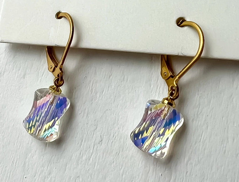 Náušnice chirugická ocel zlatá délka včetně zapínání 2,5 cm, šířka 1 cm. Duhový kámen.