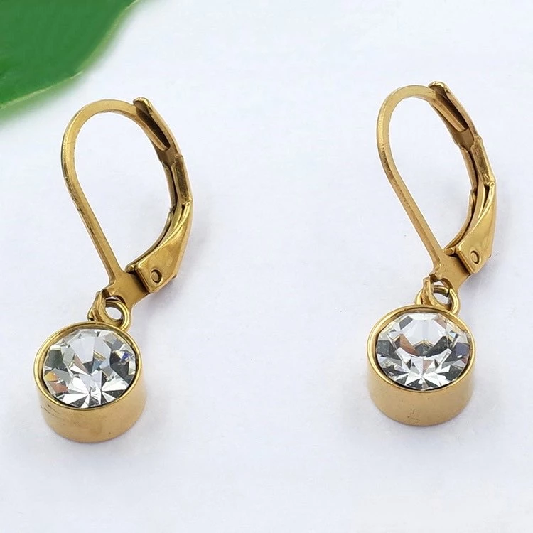 Náušnice chirugická ocel zlatá délka včetně zapínání 2,5 cm, šířka 0,7 cm. Kámen crystal barvy.
