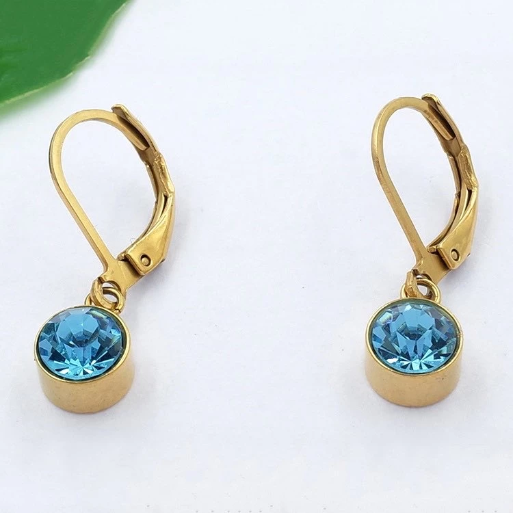 Náušnice chirugická ocel zlatá délka včetně zapínání 2,5 cm, šířka 0,7 cm. Kámen tyrkysové barvy.