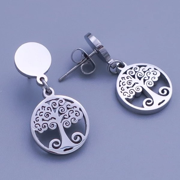 Náušnice z leštěné chirurgické oceli stromy života. Přívěsky stromy života o velikosti 12mm jsou zavěšeny na kolečkovém zapínání 7mm. Zapínání na puzetu. Celková délka náušnic 25mm. 22391