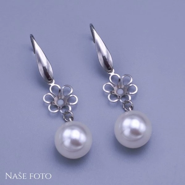 Nádherné dámské visací náušnice z chirurgické oceli. Náušnice jsou ve střední části zdobené kytičkou, na kterou je zavěšená bílá perlička. Náušnice jsou poměrně dlouhé (4,7cm), přesto decentní. Díky neutrální barvě perličky je sladíte s každou barvou oblečení. Náušnice a jiné šperky z chirurgické oceli jsou vhodné pro osoby s alergiemi na běžné kovy. Celková délka náušnic: 4,7cm Průměr perličky: 1,2mm Zapínání: puzetové 8060