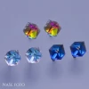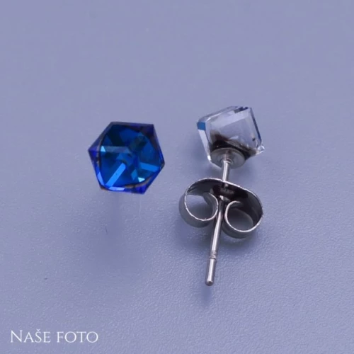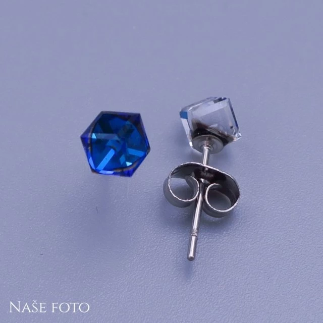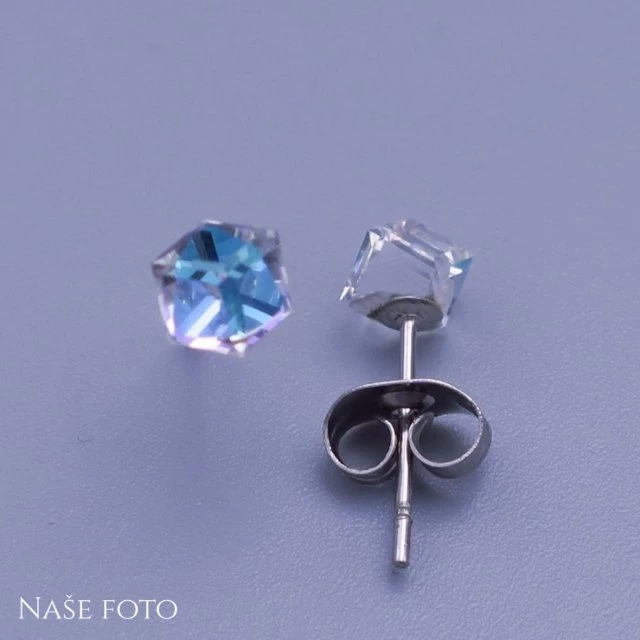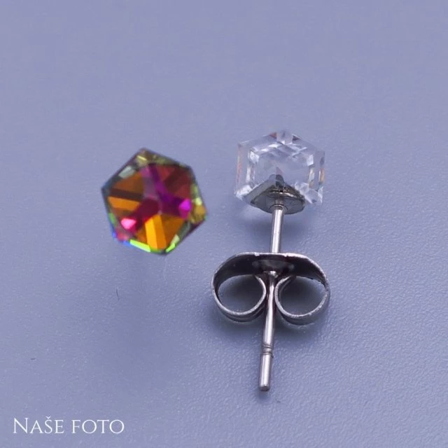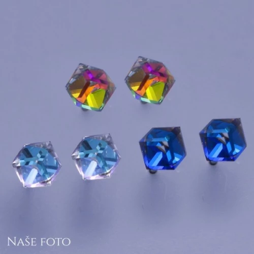 Stylové dámské peckové náušnice z chirurgické oceli, zdobené kamínky Swarovski ve tvaru kostky. Náušnice jsou dostupné ve třech variantách barev. Základem všech tří variant je čirý kamínek,který je z bočních stran čirý a z přední strany hází odlesky v různých barvách (3 varianty). První varianta náušnic má z přední strany odlesky modré barvy, druhá varianta má odlesky světle modré a fialové barvy a třetí varianta hází odlesky růžové, žluté, modré fialové. Zapínání náušnic: puzetové Rozměry kamínku: 4x4mm Barevné varianty: čirá s odlesky modré barvy (Bermuda blue); čirá s odlesky světle modré a fialové barvy (Vitrail light); čirá s odlesky růžové, žluté, modré fialové (Erinite) 7785 V případě zájmu upřesněte barvu