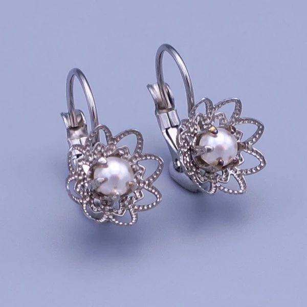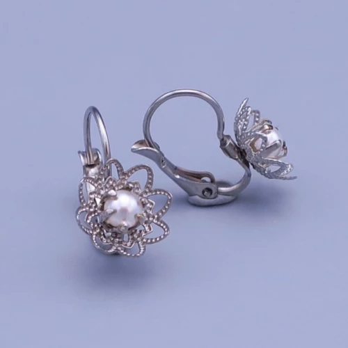 Náušnice z leštěné chirurgické oceli kytičky jsou zdobené Bílou perličkou Swarovski. Pohodlné zapínání na klapku z chirurgické oceli. Celková délka náušnic se zapínáním 17mm. 000020