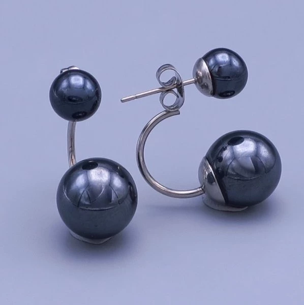 Puzetové náušnice kuličky 7mm spojuje obloukově kulička 12mm. Barva hematit. Celková délka náušnic 25mm. Chirurgická ocel je vhodná pro alergiky na běžné kovy. 000034