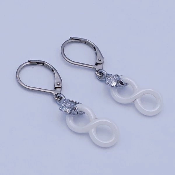 Náušnice z chirurgické oceli se skládají z keramického přívěsku infinity v bílé perleťové barvě o velikosti 15x8mm, který je zavěšen na náušnicovém zapínání z chirurgické oceli na klapku zdobeném čirým zirkonem. Celková délka náušnic se zapínáním 30mm Chirurgická ocel je vhodná pro alergiky na běžné kovy. 1276