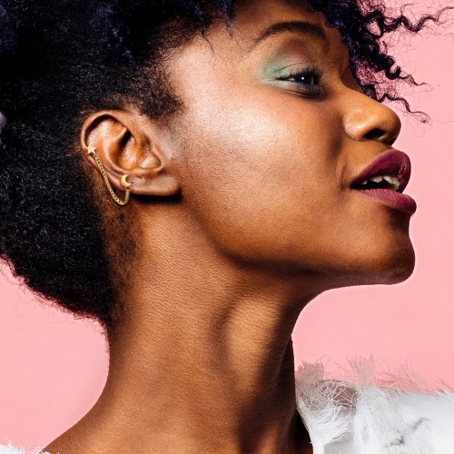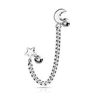 Dva kusy cartilage piercingu do ucha spojené řetízkem. Řetízek není odnímatelný