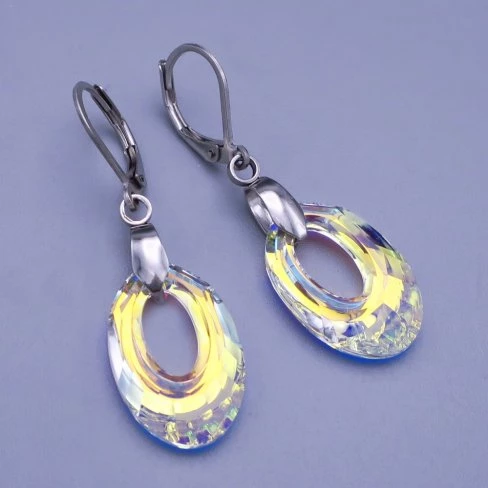 Náušnice z chirurgické oceli jsou složeny z oválků Swarovski velikosti 20x13mm v barvě Crystal AB (měnící )