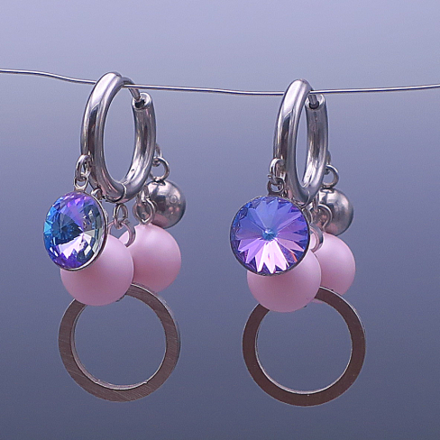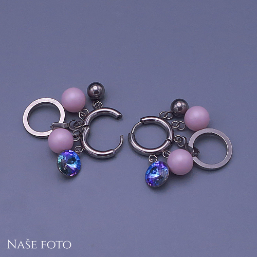 Základem jsou kroužky z chirurgické oceli (⌀ 15 mm, šířka 2 mm) doplněné o třpytivé krystaly Swarovski (8 mm) v odstínu Vitrail Light, který se mění od růžové po fialovo-modrý tón podle dopadu světla.