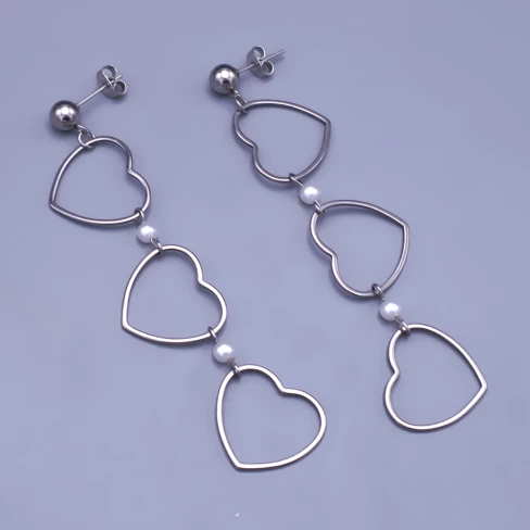 Výrazné a přitom jemně romantické visací náušnice z chirurgické oceli, které kombinují otevřená srdíčka s drobnými bílými perličkami. Dlouhá linie náušnic krásně prodlužuje krk a dodává šperku lehký pohyb při každém kroku.